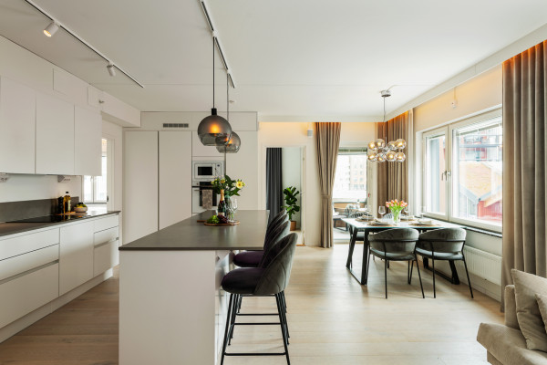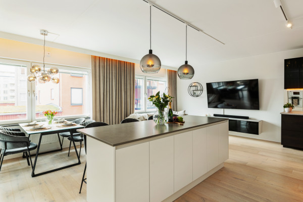 Bostaden präglas av en öppen och social planlösning där kök och vardagsrum samspelar på ett naturligt sätt. Den generösa köksön blir en självklar plats att samlas kring och bidrar till en inbjudande och levande känsla i hemmet. Interiören går i en lugn och harmonisk ton och tillsammans med den genomtänkta ljussättningen skapas en atmosfär som för tankarna till ett modernt hotellrum, en känsla som följer med genom hela bostaden.