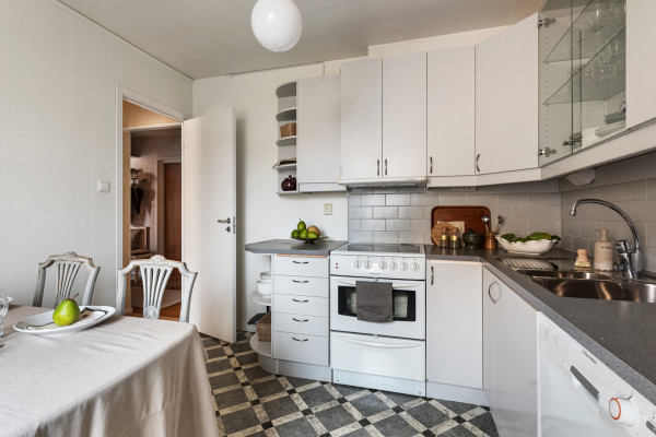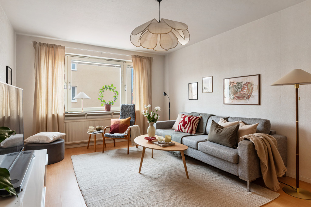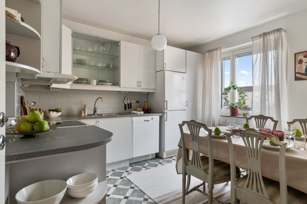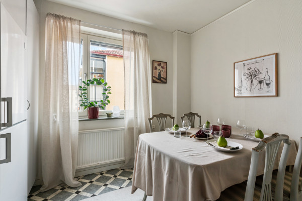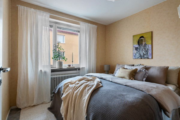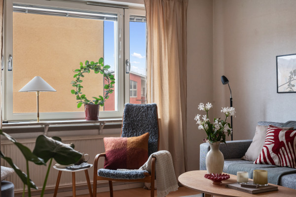 Här möts du av en bostad som präglas av funktion och ett behagligt ljusinsläpp. Planlösningen är genomtänkt med rum i rätt proportioner. Köket är ljust och trivsamt, med plats för matbord intill fönstret – en självklar samlingspunkt för såväl vardagsfrukostar som långa samtal framåt kvällen. Här finns gott om förvaring och arbetsytor som bjuder in till matlagning med omtanke och tradition. Vardagsrummet är lättmöblerat och rofyllt, med fönster mot föreningens lugna innergård – en vy som skänker stillhet och grönska i västerläge med kvällssol. Sovrummet erbjuder plats för dubbelsäng och förvaringslösningar, en privat sfär för vila och återhämtning. Det stambytta badrummet är rymligt och praktiskt, utrustat med badkar och tvättmaskin, vilket ger en bekväm vardag.