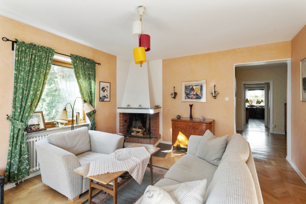 Genom öppningen från allrummet nås vardagsrummet, ett ljust och trivsamt rum med fönster i två väderstreck som släpper in rikligt med dagsljus. Här finns gott om plats för en generös soffgrupp och rummets självklara mittpunkt är den öppna spisen.