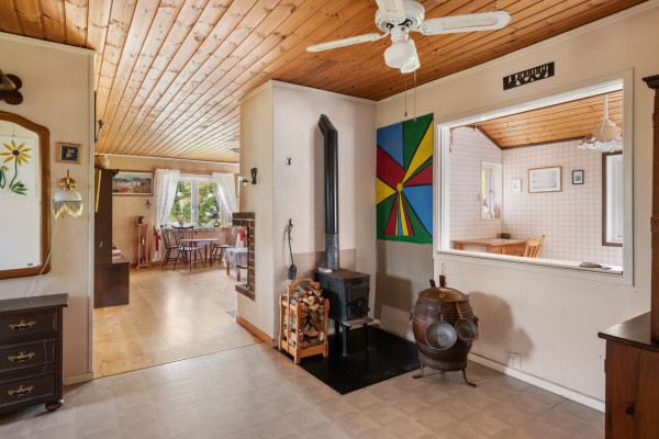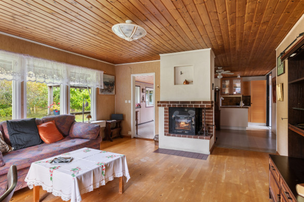 Välkomnande allrum med stora fönsterpartier i två väderstreck som ger ett fint ljusinflöde samt en värmande öppen spis. Parkettgolv, vävtapet på väggarna samt panel i taket.