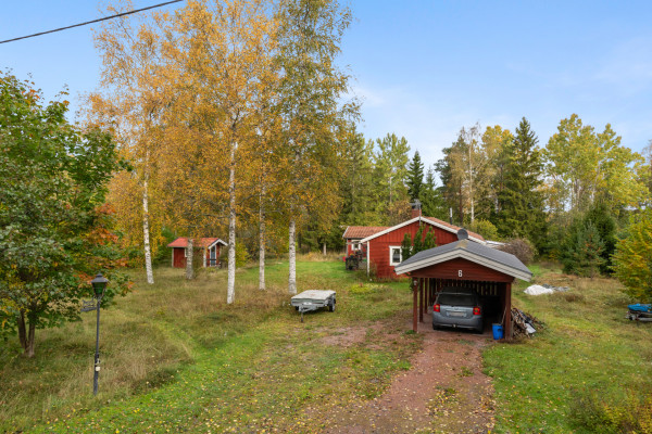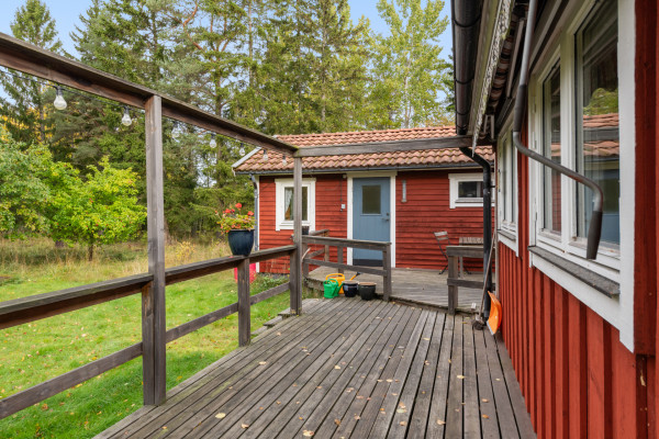På tomten finns dessutom ett isolerat uthus med gästrum, duschrum och förråd, en fristående friggebod som idag används som snickarbod samt en praktisk carport. Trädgården är uppvuxen och inbjudande, med gräsytor för lek och äppelträd som blommar vackert om våren. Fastigheten har ett visst renoveringsbehov, men erbjuder samtidigt stora möjligheter för den som vill skapa sitt eget smultronställe på eftertraktade Väddö.