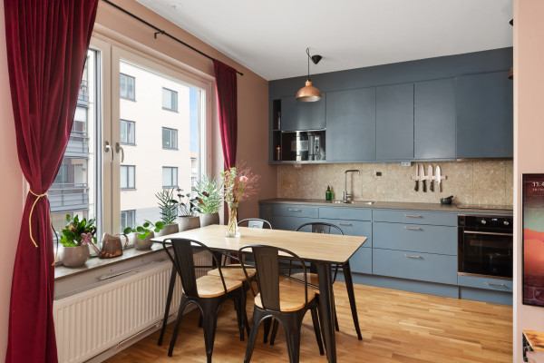 Kök och vardagsrum ligger med öppen planlösning och är ett rum som vågar färg på ett stillsamt och smakfullt sätt. Här möts dova nyanser av rosa och blått i en kombination som känns både modern och ombonad. Den öppna planlösningen bjuder in till umgänge och gör det enkelt att samla vänner och familj. Vardagsrummet rymmer soffa och vid fönstret finns plats för ett matbord för fyra till sex personer.