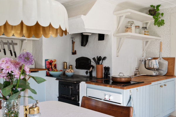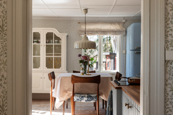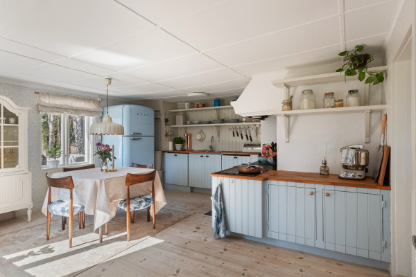 Köket utgör hemmets naturliga hjärta med sin generösa yta och inbjudande karaktär. Här möts sekelskiftescharm och lantlig känsla i ett platsbyggt kök med tidstypiska inslag såsom vedspis, vedugn och en vacker spiskåpa. Fönster i två väderstreck, samt ljusinsläpp från ett tredje håll, bidrar till ett fint och levande ljus genom hela dagen. De ljusblå skåpen tillsammans med öppna, platsbyggda hyllor ger plats till förvaring. På golvet ligger ett ljust plankgolv som passar fint med ljusa tapeter och beigemålad panel ovanför skåpen. Bänkskivorna är i massivt trä och förstärker den lantliga känslan. Den maskinella utrustningen består av en stor kyl och frys från Smeg (2020), spishäll och ugn från Electrolux samt integrerad diskmaskin och tvättmaskin från Hotpoint. I rummet finns plats för matgrupp åt ca 6-8 personer, perfekt för er som gillar att ha vänner och familj på besök.