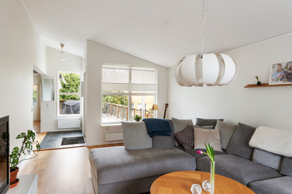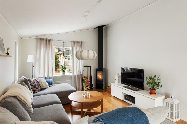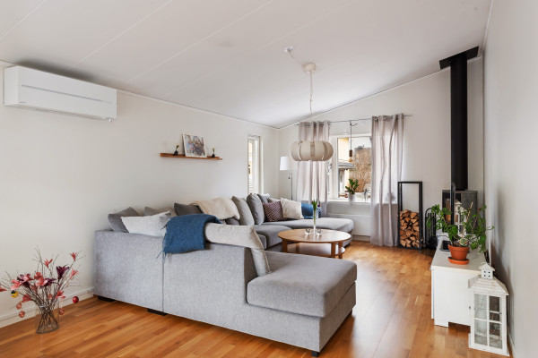 Vardagsrummet är rymligt och har trevlig karaktär och fint ljusinsläpp. Den generösa takhöjden bidrar till en luftig och trivsam känsla. Här finns gott om plats för en större soffgrupp. Braskaminen i täljsten ger både värme och mysfaktor. I vardagsrummet sitter luftvärmepumpen som är mycket effektiv och skapar behaglig komfort i huset under alla årstider.