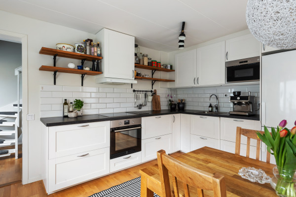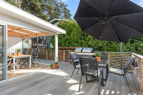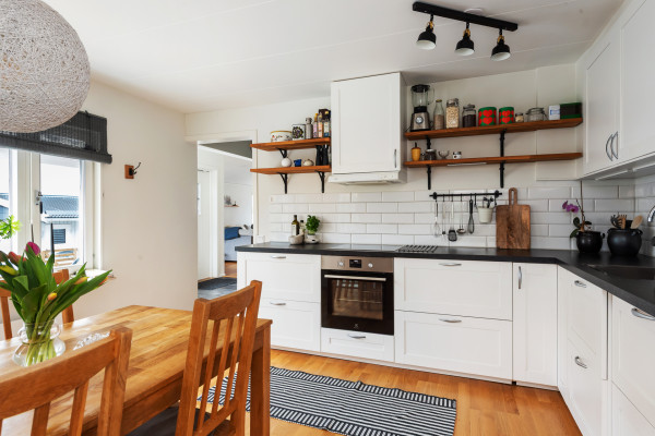Modernt och trivsamt kök med matplats för upp till sex personer. Köket har vita, profilerade köksluckor, mörk laminatbänk och vitt kakel ovan arbetsytorna. Fullt maskinellt utrustat med kyl, frys, integrerad diskmaskin, varmluftsugn, spishäll, spisfläkt och inbyggd mikrovågsugn. Köket har fönster i två väderstreck vilket ger ett fint ljusinsläpp. Från köket nås det trevliga uterummet som är väl tilltaget med gott om plats för bord och soffgrupp. Här kommer du spendera många timmar tillsammans med familj och vänner.