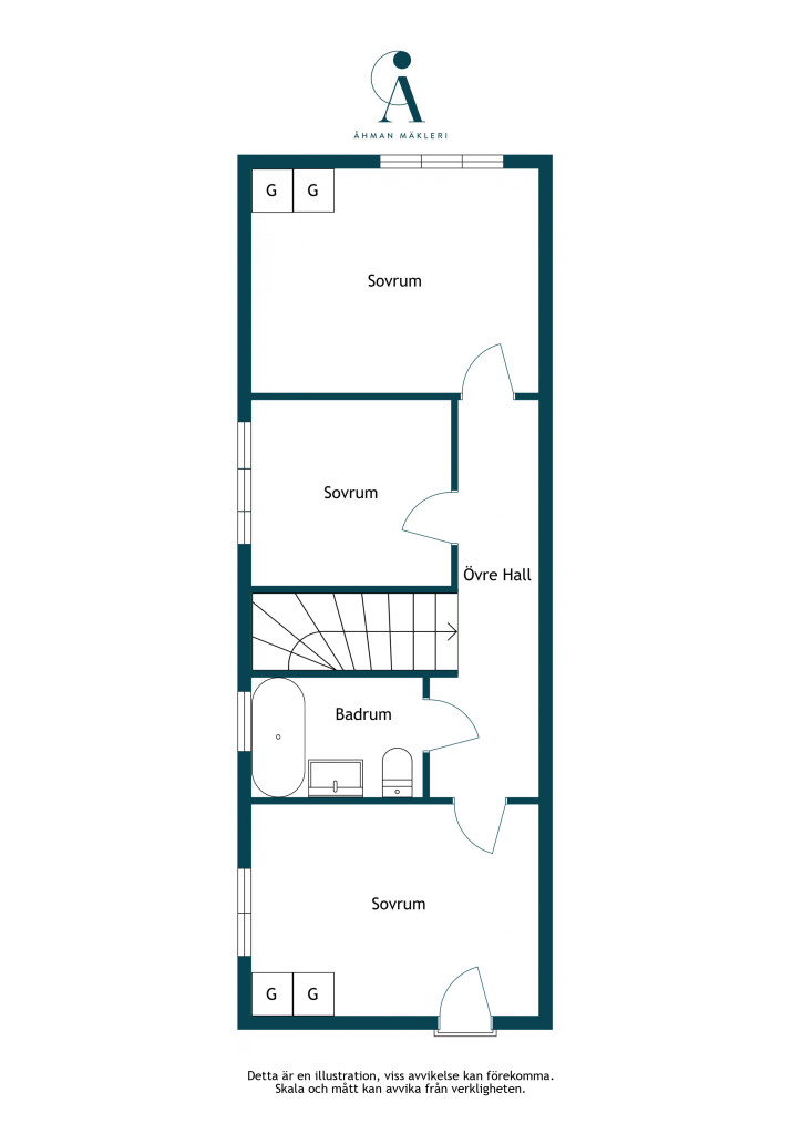 Via trappan nås övre plan och en långsmal hall som fungerar som passage till de olika rummen. Här finns totalt tre sovrum och ett badrum.