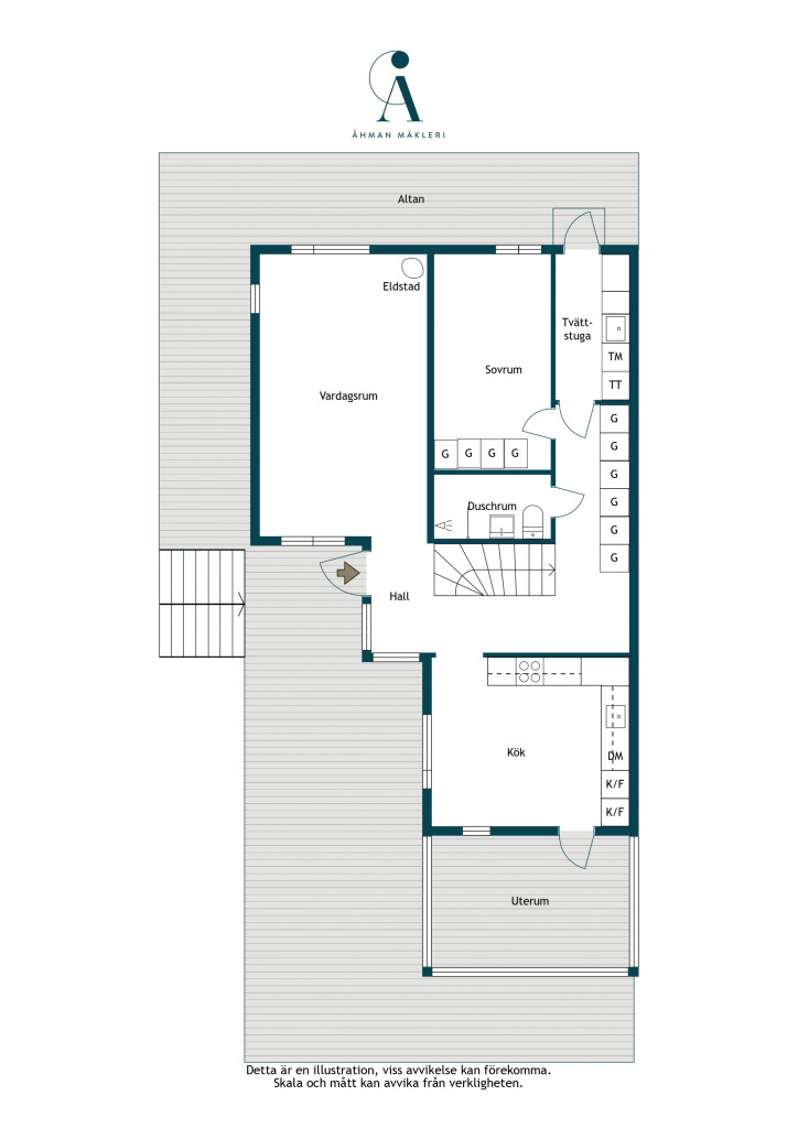 Entréplanet erbjuder ljusa och trevliga ytor. Planlösningen är genomtänkt och knyter samman de sociala delarna på ett naturligt sätt. Vardagsrummet har en täljstenskamin och generös takhöjd som skapar en härlig känsla av rymd. Här finns även ett trivsamt kök med utgång till uterummet. Under de ljusa årstiderna smälter ute- och innemiljö samman till en naturlig enhet genom trädäck och uterum. På entréplanet ligger även ett av husets sovrum, duschrum samt tvättstuga.