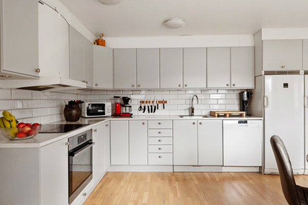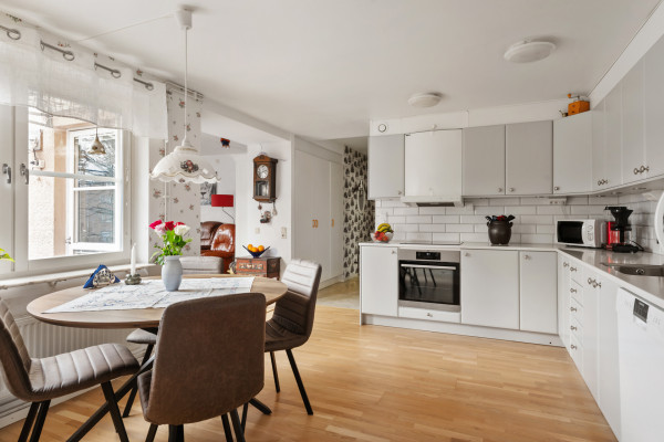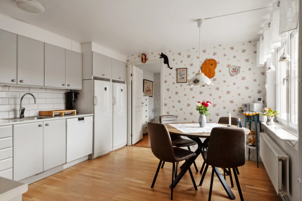 Köket renoverades 2018 och uppdaterades med nya gedigna luckor 2025, har gott om förvaring och arbetsytor samt matplats för fyra till fem personer vid det stora fönstret som vetter ut mot matplatsen. Köket är stilfullt men samtidigt ombonat med släta, grå köksluckor, vitt kakel ovan arbetsytorna, ljus laminatskiva, blommönstrad tapet som ger köket en hemtrevlig känsla. Den maskinella utrustningen består utav kyl, frys, diskmaskin, inbyggnadsugn, induktionshäll och spisfläkt.