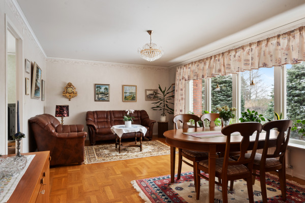 Vidare in till vardagsrummet, även detta rum tar nytta av de stora fönsterpartierna som släpper in massor av solljus. Här finns plats för stor soffgrupp och TV-möbel. Efter detta finns plats över för matbord och annat möblemang. På golvet ligger fin holländsk parkett som tillsammans med de ljusa tapeterna utgör en fin kombination. I detta rum är innertaket ett spänntak.