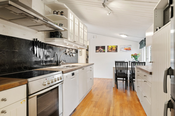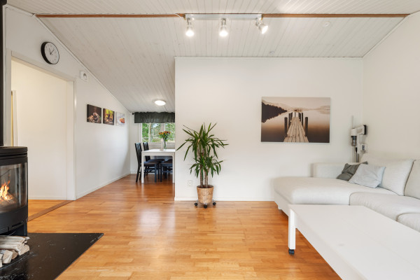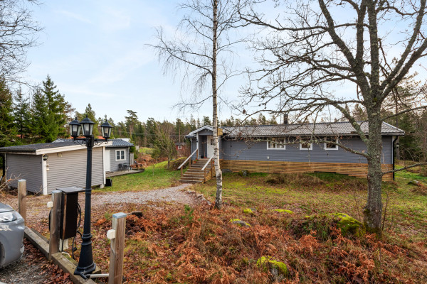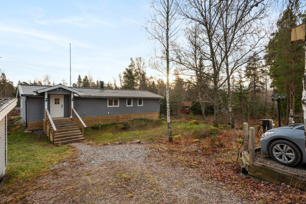 Hela huset har en generös takhöjd som löper genom hela bostaden och ger en känsla av frihet som möter dig redan i den rymliga hallen. Det ljusa köket bjuder in till vardagens måltider medan allrummet, med höga fönster och värmande kamin, blir den självklara platsen där både dagar och kvällar finner sitt lugn framför elden. Tre sovrum ger gott om utrymme för familj och gäster, och både det renoverade duschrummet och toaletten går i tidlösa toner. Tomten omsluter huset med grönska, natur och lekvänliga ytor, och på baksidan väntar en insynsskyddad altan som låter sommarens stilla kvällar bli långa och minnesrika.