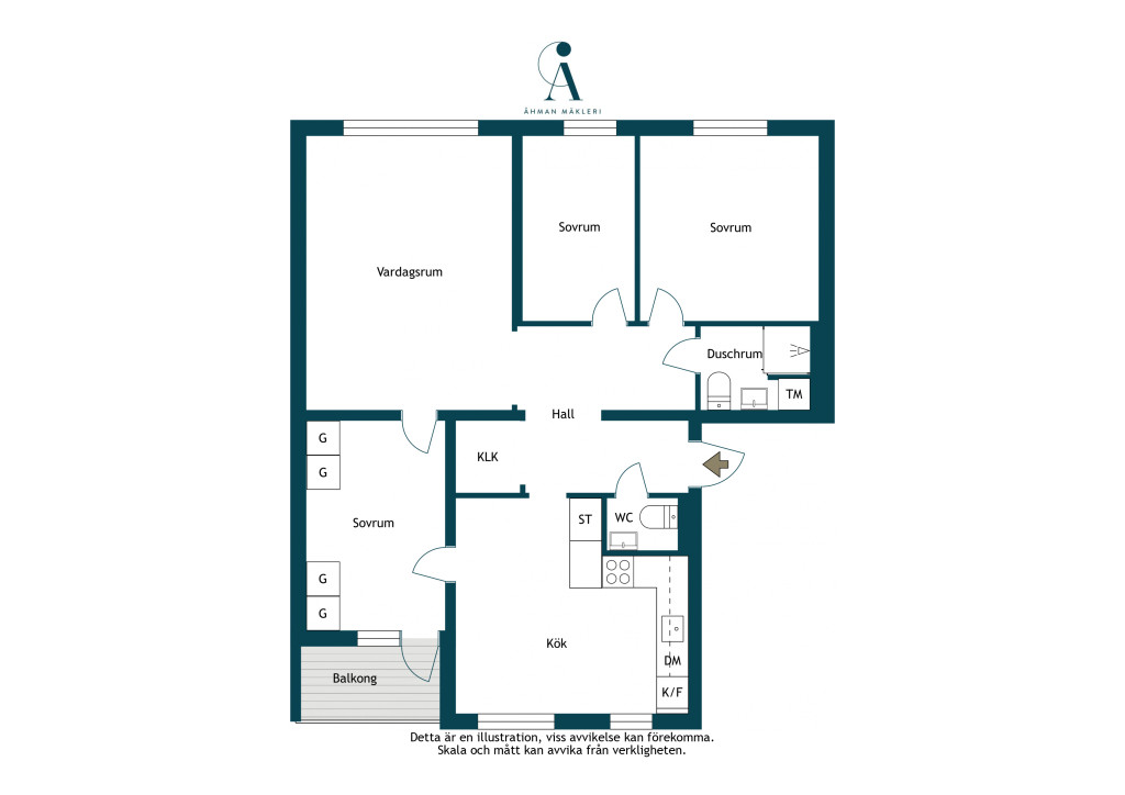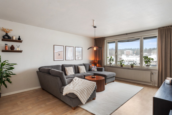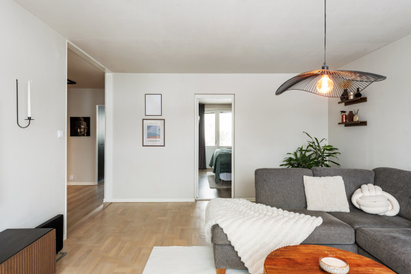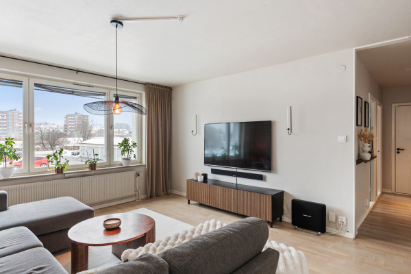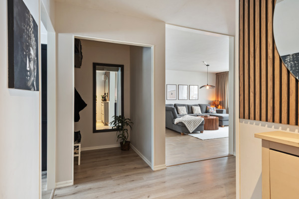 Endast en halvtrappa upp finner vi säkerhetsdörren som leder oss in till hallen. Direkt innanför dörren får vi ta del av den helrenoverade och moderna känslan som erbjuds genomgående i lägenheten. På golvet ligger ljust laminatgolv som kombineras med målade väggar i gråbeige kulör, dessa ytskikt sveper vidare i princip hela lägenheten, väldigt trevligt med enhetlighet! I samtliga rum förutom hallen finns stora fönsterpartier som släpper in gott om dagsljus. I hallen finns platsbyggd skomöbel, klädkammarutrymme som idag är öppen yta till förvaring, akustikpanel för modern känsla och dimbara spotlights i skena. Utöver allt detta finns plats över till inredning och förvaringsmöbler.