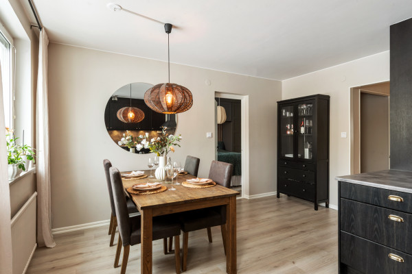 När nuvarande ägare av Sandgatan 15 A tog över lägenheten 2024 gick startskottet för totalrenoveringen, det enda som bevarades är Länghemsköket som tidigare ägare nyligen hade installerat. Till en början förseddes hela lägenhetens golv med genomgående laminat i ljus kulör (förutom vardagsrummet som har originalparketten kvar), väggarna målades i smakfull gråbeige kulör som passar fint med de ljusa golven, originalgarderoberna monterades ned, nya socklar har installerats och dörrar har fått nytt foder samt öppnats upp för att ge mer rymd i lägenheten. Även under denna tidsperiod fick badrummet en totalrenovering, stammarna byttes 2011 av föreningen. Nästa år var det dags för lilla toaletten att få helrenovering, i samma veva platsbyggdes garderober runtom sängen i stora sovrummet och balkongen försågs med trall. Under 2026 har renoveringen fortsatt med uppslipning och vitlackering av den Holländska parketten i vardagsrummet, i köket byttes beslagen och ytskikten fick sig en uppfräschning. Nu står en helrenoverad lägenhet i barnvänligt område redo för sina nya ägare, se rumsbeskrivning nedan: