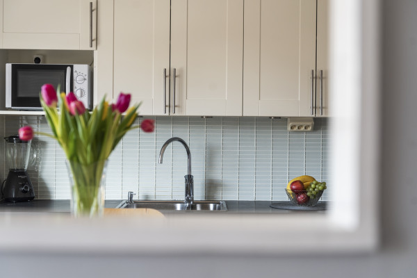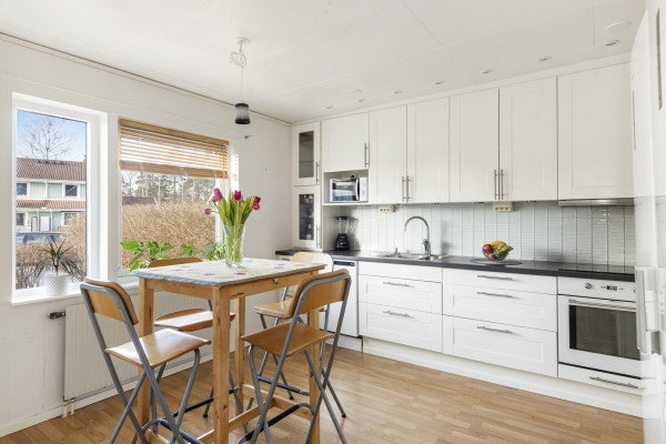 Köket är ljust och trivsamt med vita, profilerade köksluckor, mörk laminatbänk och kakel ovanför arbetsytorna. Bra belysning med infällda spotlights i taket ovanför arbetsytorna. Köket är utrustat med spishäll, inbyggnadsugn, spisfläkt, diskmaskin, kyl och frys. Vid fönstret som vetter mot framsidan finns matplats för fyra till fem personer.