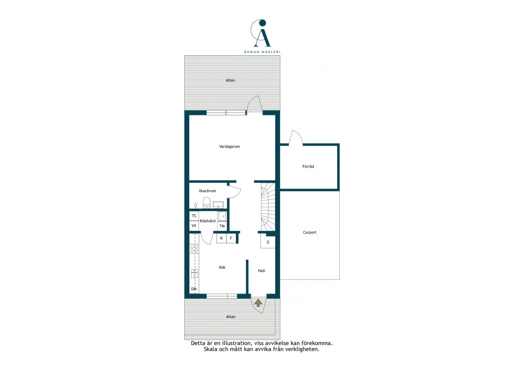 Entréplanet rymmer husets sociala ytor med kök och vardagsrum, kompletterat av praktiska funktioner som duschrum och tvättstuga. Härifrån nås även baksidan med dess härliga läge mot skogen.