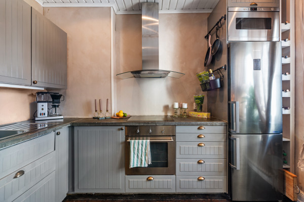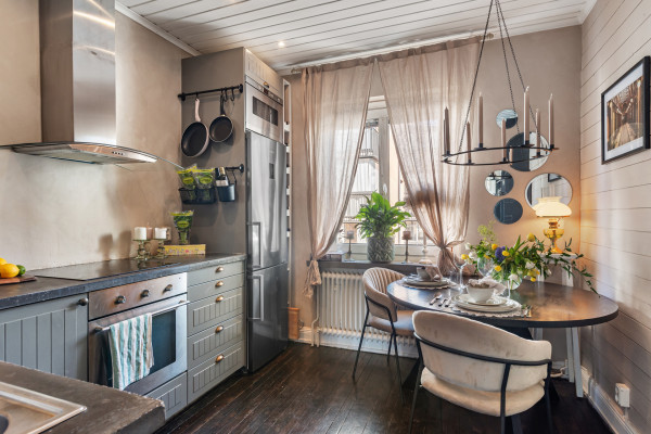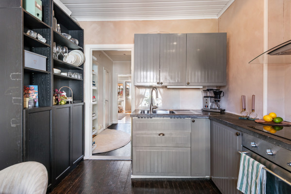 Vidare in till köket som renoverades av tidigare ägare under 2014. Köket kommer från IKEA och erbjuder förvaring i under- samt överskåp, båda är målade på senare tid i grå kulör. Bänkskivorna är gjutna och är av betong. Den maskinella utrustningen kommer i rostfritt utförande och består av kyl/frys, micro, induktionshäll, ugn och kolfilterfläkt. I köket finns utrymme för matbord åt ca fyra personer intill fönstret. Väggarna är målade i beige kulör och golvet består av mörkbetsat plankgolv.