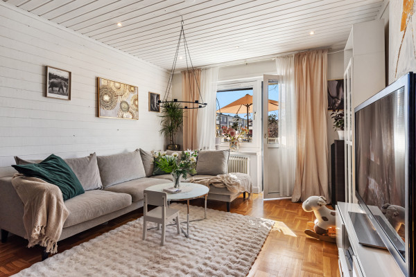 Vardagsrummet har gott om ljusinsläpp som belyser upp den holländska parketten och skapar en härlig atmosfär i rummet. Kombinerat med det fina golvet är väggarna målade i vit kulör, på ena väggen finns liggande träpanel som är vitmålad. I rummet finns plats för soffgrupp, tv-möbel, extra matgrupp när vännerna är på besök och plats över för inredning. Här finns dörren som leder ut till den mysiga balkongen i soligt söderläge.