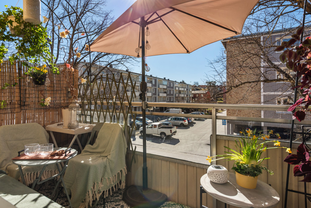 • Beskrivning uteplats: Den mysiga balkongen är belägen i härligt söderläge. Här finns en fin balans av sol och skugga under dagen tack vare de fina träden som växer på Esplanaden. Balkongen mäter ca 3,5 kvm och rymmer utemöbel och växter. På golvet ligger plank.