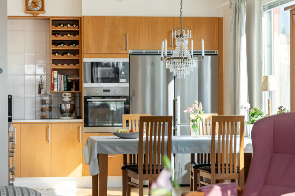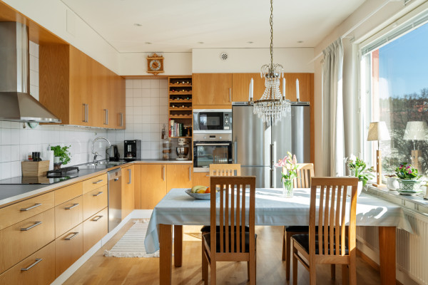 Det kvalitativa köket kommer från den omtyckta tillverkaren Ballingslöv. En fin kombination av ek i sin naturliga färg som möter vitt kakel och rostfria vitvaror på stilfullt sätt. Förvaring finns det gott om i kökets välbalanserade upplägg av lådor, under- och överskåp, perfekt för den som vill ha ordning och reda i köket. En rejäl bänkskiva av laminat ger er generös plats för matberedning där spotlights både under överskåpen och i taket hjälper till med ljussättningen. I samma fina utförande i ek finns även ett vinställ. Den maskinella utrustningen kommer från Electrolux förutom spisfläkten som kommer från Franke. Utrustningen består av ugn (ca 6 år), micro, induktionshäll, spisfläkt, diskmaskin (ca 3 år) och kyl/frys i fullstorlek (ca 2 år).
