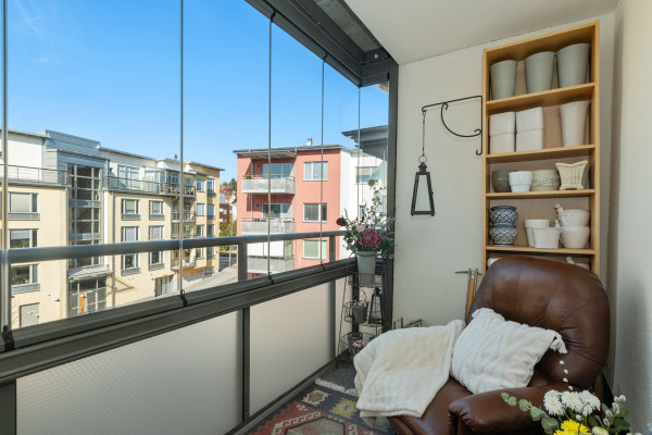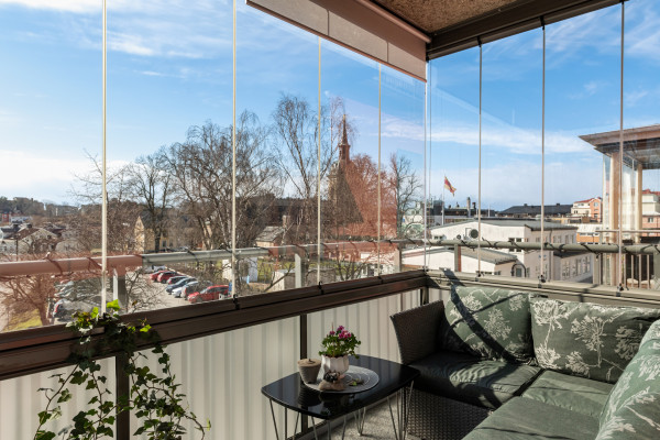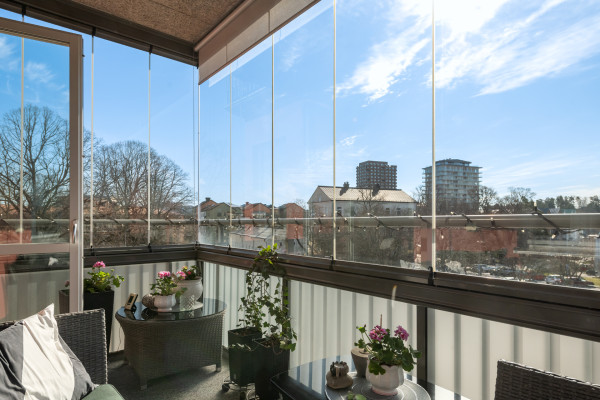 • Beskrivning uteplats: Lägenheten är utrustad med två rejäla balkonger som dessutom är inglasade. Den första är belägen i perfekt söderläge och ger fin utsikt ner mot hamnen. Här finns insynsskydd i underkant och rullgardiner finns mot söder. Inglasningen är påkostad och ger er möjligheten att öppna upp alla glaspartier.