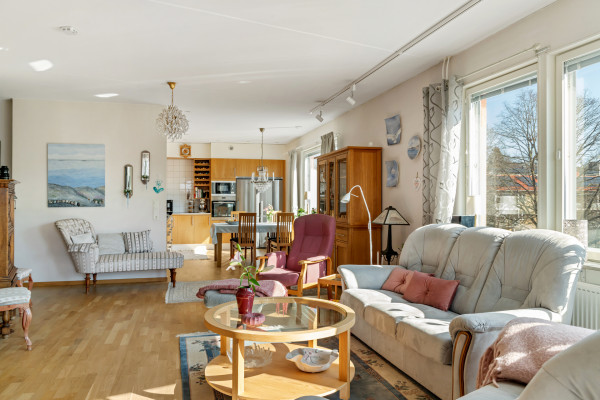 Vidare in till vardagsrummet som är i öppen planlösning mot köket men ändå känns som sitt egna, bästa av två världar! Här finns underbart ljusinsläpp tack vare stora fönsterpartier som också ger fin utsikt mot parken och hamnen. Hela ytan i vardagsrum och kök mäter ca 40 m², vilket ger stora möjligheter för möblering efter egen smak och årstid. I taket finns utvändigt spotlights som sitter i skena. I rummet finns dörren som leder ut till den första balkongen som är belägen i soligt söderläge!